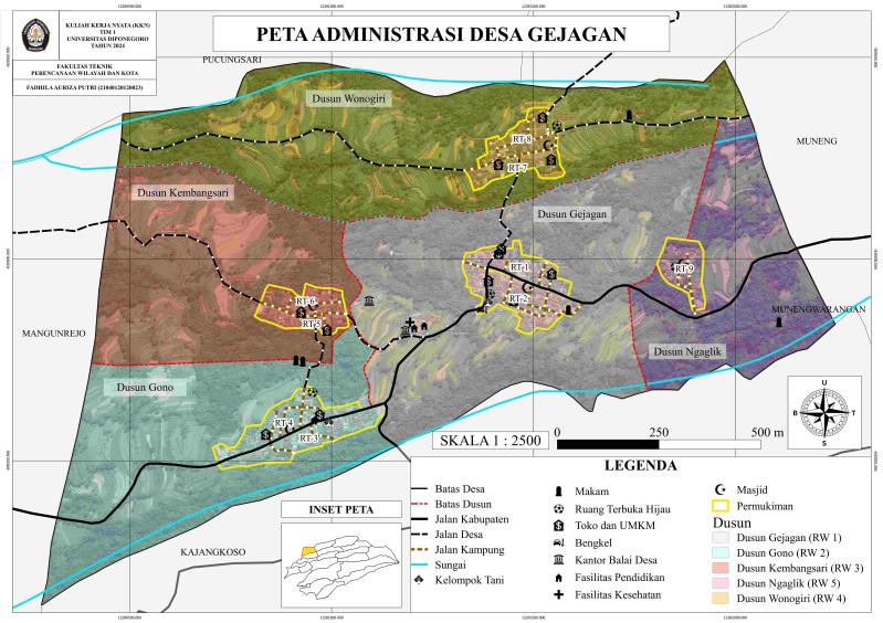 Magelang, 09 Februari 2024 - Mahasiswi KKN TIM I UNDIP Periode 2023-2024, Fadhila Auriza, dari Program studi Perencanaan Wilayah dan Kota Fakultas Teknik 2020 telah melaksanakan program kerja monodisplin dalam rangka Kuliah Kerja Nyata sebagai hasil implementasi hasil studi selama masa perkuliahan. Program kerja yang diangkat adalah “Pembuatan Peta Administrasi Desa dan Denah Batas Dusun di Desa Gejagan”. Dalam program kerja tersebut Fadhila telah melaksanakan pembuatan peta administrasi Desa Gejagan. Peta ini memberikan informasi spasial mengenai letak administratif Desa Gejagan. Program kerja ini diangkat karena kantor Balai Desa Gejagan belum memiliki informasi terkait batas administrasi desa dan dusun, sehingga informasi spasial belum tersedia dan dapat menjadi informasi bagi pembangunan wilayah. Program ini melibatkan peran serta para Perangkat Balai Desa Gejagan dan perwakilan masyarakat.