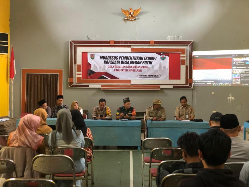 Desa Gejagan (26/05), Berdasarkan Petunjuk Pelaksanaan Menteri Koperasi Republik Indonesia Nomor 1 Tahun 2025 tentang Pembentukan Koperasi Desa Merah Putih, Sehubungan dengan hal tersebut Pemerintah Desa Gejagan mengadakan kegiatan Musyawarah Desa Khusus Pembentukan Koperasi Desa Merah Putih pada hari Senin (26 Mei 2025), Jam 08:30 s/d selesai, di Gedung Graha Mulya Desa Gejagan. Kegiatan tersebut dihadiri oleh Tim Monitoring Kecamatan, Bapak Kapolsek, Bapak Babinsa, Kepala Desa Gejagan beserta Perangkat Desa, BPD, Lembaga Desa, Tokoh Masyarakat, Tokoh Pemuda, Tokoh Perempuan, Pelaku UMKM.