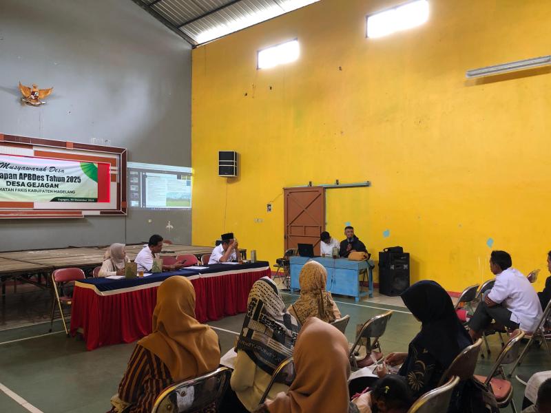 Desa Gejagan (22/01), Pada hari ini Rabu, 22 Januari 2025. Pemerintah Desa Gejagan melakukan musyawarah terkait penetapan APBDes. Musyawarah Desa Musdes tentang Penetapan Anggaran Pendapatan dan Belanja Desa APBDES Tahun Anggaran 2025 telah berlangsung di Gedung Graha Mulya. Pertemuan Masyarakat Desa Gejagan mulai pukul 09.00 WIB. Acara ini dibuka langsung oleh Kepala Desa Gejagan dan Sekretaris Desa bersama Ketua BPD Desa Piasan dan dihadiri oleh berbagai elemen masyarakat termasuk RT/RW, anggota BPD, perangkat desa, kader-kader desa dan posyandu PKK serta pendamping desa.