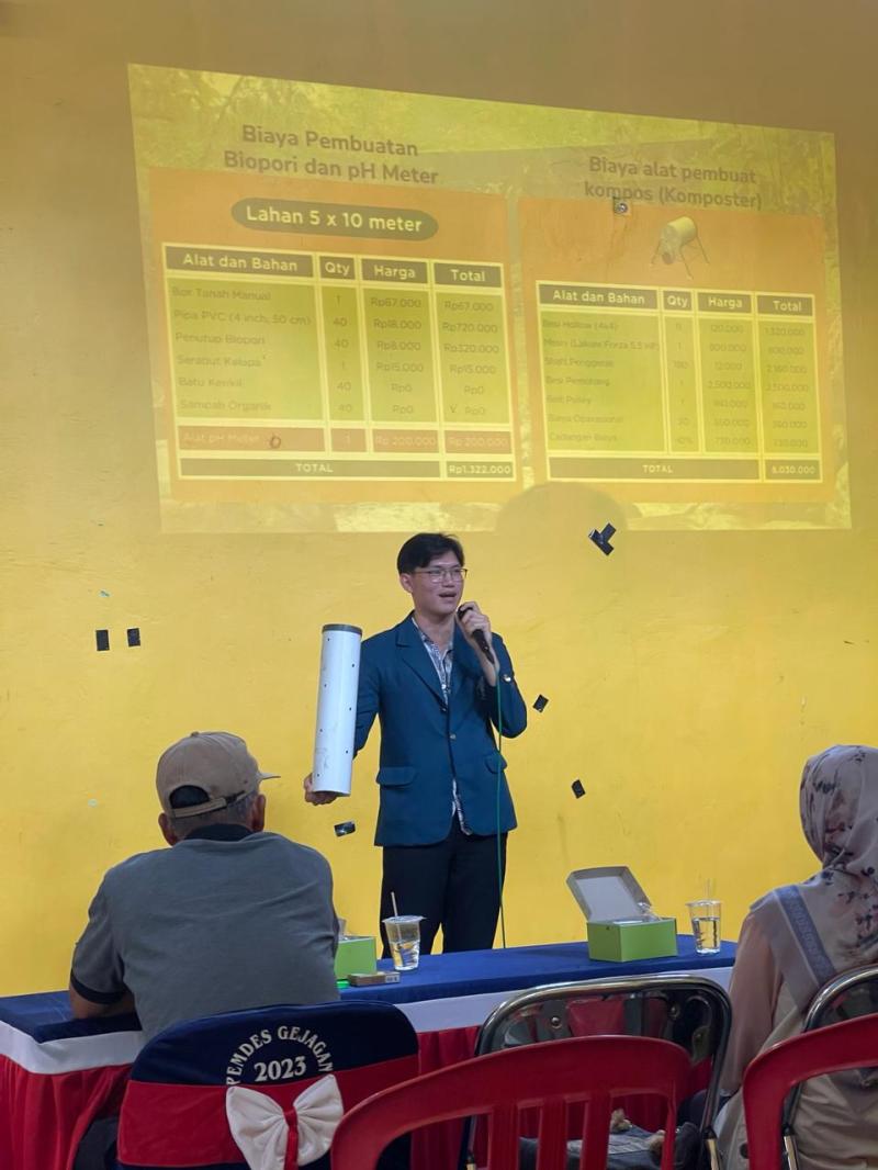 Magelang, 09 Februari 2024 – Mahasiswa-mahasiswi KKN TIM I UNDIP Periode 2023-2024, telah melaksanakan program kerja multidisiplin untuk mengatasi permasalahan dalam bidang pertanian dengan konsep agroteknologi. Agroteknologi adalah pemanfaatan teknologi dalam bidang pertanian, hortikultura dan budidaya perairan yang dapat meningkatkan hasil yang berkualitas dan efisien. Konsep ini diterapkan di Desa Gejagan dengan mengimplementasikan beberapa inovasi baru berupa pemasangan biopori dan alat pH meter untuk menuju pertanian berkelanjutan. Pemasangan biopori dilakukan untuk menyimpan air tanah dalam pertanian agar ketika musim kering tidak terjadi kekeringan tanah yang digagas oleh Bintang (Teknik Sipil). Sedangkan alat pH tanah digunakan untuk mengukur tingkat keasaman tanah agar dapat menentukan treatment dan tanaman yang sesuai dengan pH tanah yang digagas oleh Iqbal (Teknik Sipil). Adapun pembagian kerja dan tugas dari masing-masing anak dalam tim pada program kerja multidisiplin ini adalah sebagai berikut: